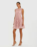 This charming mini dress features a high neckline, sleeveless design, and allover ruffle detail for a chic, playful look. Perfect for daytime occasions, it effortlessly blends elegance with a fun twist.