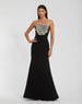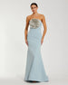 This stunning crepe trumpet gown features a strapless neckline, sleeveless design, and an embellished 3D rhinestone flower.